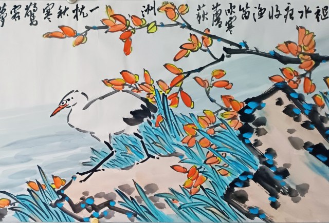 大面积留白与计白当黑的布局,既呼应传统美学,又强化画面空间的无限延展性。  图片说明 诗画互文:哲学追问与生命诗性 薛晓勇的题画诗与画面深度互文,如《秋分》诗中“忽惊雪影穿云出,犹带芦花一缕香”,将白鹭的视觉美感升华为时空永恒的哲思。
