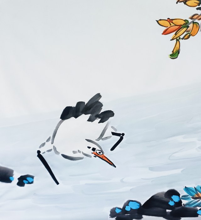 图片说明(局部) 意象革新:从“孤高”到“孤洁”的精神升华 薛晓勇的白鹭以“仰首向天”的标志性姿态,颠覆了传统禽鸟的被动隐逸形象,赋予其主动选择的精神独立性。如他题画诗所言“自许孤洁非避世”,将孤高转化为对世俗的清醒认知与超越。