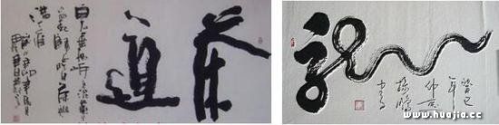 “茶道”、“龙”,但凡上过小学,大多能看明白这两幅字,“茶道”二字似修行,龙字摆尾似腾飞。看似个性十足,实乃落入江湖书法俗套,脱离书法艺术基本章法,一味以造型取悦受众,难脱画字之嫌。