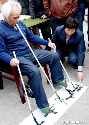 此君书法技艺更为了得,居然一心五用。不过细看之后,怎么会产生一种街头看猴戏的愉悦感?原来,此君已把书法演变为杂耍了,而且还炼得“炉火纯青”。