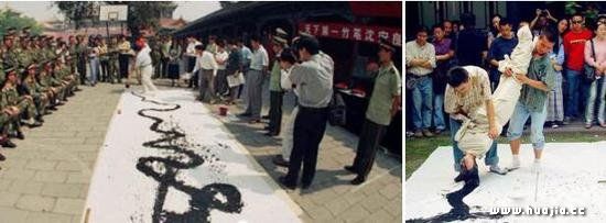 以大地为纸,以扫把或头发为笔,行走龙蛇,纵情水墨,一气呵成。此情此景确实唬人。在似懂非懂间感受江湖书法的高深莫测,书法此时似乎已成为十足演艺。艺术造诣此时已不重要了,重要的是演艺过程。“内行看门道,外行看热闹”,以上两幅图应该就是这句大众名言最好的诠释吧。 江湖书法实乃高深,难以一一阐述,以笔者之功力无法深究,非但不能让江湖书法现形,而且还会错怪他人。若有更多资深书法人士铁肩担当,大力弘扬中国传统书法艺术,让普通受众时时处处感受真正书法艺术,那么,江湖书法就彻底现形了。近日,笔者听闻中国书法家协会正组织书法家们下基层。艺术惠民,重在行动,此乃书法大幸,中国传统文化大幸也。