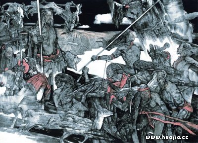 轩辕黄帝(国画) 2018年 陈钰铭 “山西一个逢集的小镇上,有个个头不高满脸沾土的小青年捧着大大的速写本,尾随一位老汉边走边画,弄得老汉抡起扁担撵他。小青年躲闪,有几分不依不饶,弄不清老汉为个啥。一老乡说:‘人家肚子里还没食呐!’小青年心里有些酸,赶忙跑去买来10个肉夹馍。老汉说:‘我是革命老区人,穿的破,不能让人随便乱画,拿去发表丢老区的人。’两人边吃、边画、边唠,成了忘年交……”海军政治部创作室老艺术家张道兴20年前的一段描述惟妙惟肖,其主人公就是当代水墨人物画家陈钰铭。 如今,当初的小青年从军博创作员的岗位上退休了,但他的水墨工作室已聚集起百余位学生。11月17日,“永怀初心——陈钰铭师生作品展”在中国人民革命军事博物馆展出,78名参展者、大尺幅作品、现实题材……在现实题材创作十分稀缺的当下,自觉关注和描绘底层中国老百姓的日常生活、悲欢离合,并形成一种整体效应,这不能不让人思考。“他在做两个工程,一是国家主题性美术工程,一是培养主题性美术创作人才的工程。”中央美术学院教授殷双喜说。 关于主题创作 认识陈钰铭的人都对他一口纯正的河南话印象深刻。口音执着不变、一贯低调沉默,貌似粗糙却内心敏感,对洛阳小吃如数家珍、听河南豫剧十分入迷,古都洛阳出生的陈钰铭将骨子里对民族深沉的爱,朴素地化为笔下对底层关怀的创作主题和人性的不懈追问。《二月二龙抬头》中那些陶醉在歌舞中的鼓手与秧歌艺人,坚定地行走在黄土地上的《艺人韩贵山》,充满力量的《西部筑路工人》等,从现实生活到文化记忆乃至军事题材、历史叙事,他的画所体现的精神越来越厚重。 他的画也是颇具辨识度的——尺幅巨大、气势磅礴、笔墨有力、情感抓人。从1995年《历史的定格》、1996年的《向日葵》《天籁》到1999年的《大河上下》,这些代表性作品确立了陈钰铭的艺术风格,也体现出艺术家对李伯安的“重”“黑”“密”的吸收,对柯勒惠支的悲悯主题的借鉴,对苏里科夫宏大构图和批判性写实的学习,甚至是对卢西恩·弗洛伊德的怀疑、探索等。2009年入选国家重大题材美术创作工程的作品《我的家在东北松花江上》,50多个人物、大块面构图、气氛悲壮苍凉……被誉为新世纪的《流民图》。 关于写生 很难说,是他的经历造就了如今的艺术方向,还是骨子里问苍生的情怀牵引着他的艺术实践。几十年来,他持续行走于山西、陕西、内蒙古、甘肃等地,那里的土塬沟壑和老百姓的普通生活,是他发掘不尽的艺术源泉。 “我去南方采风找不到感觉,但是一到陕北,我的心都乱了。总觉得上辈子来过一样,往沟里一坐,那鬼鬼神神都出来给我打招呼,所以我画起来,特别得劲。” 陈钰铭举例说,每次到一个叫十八墩的地方,心都会揪一下,后来自己有车了,他终于找到了那个沟坎,“往那里一坐,就产生了幻觉” ,于是他在写生作品中加了很多小红人。 “事实上,我把这些称为风景,而不是山水。”陈钰铭指着展览上那些小幅的山水写生作品时说。“不是有点皴法、点几个点、景致不同就是写生”,他十分强调与自然的对话和用心交流。因此,他往往一个地方每天就画一张写生,几年来攒了200多张。 如果说陕北是他的精神原乡,写生就是他寻觅的必经之路。自幼习画,从12岁时师从李伯安,到后来进天津美院、浙江美院,知青岁月、部队生涯等等,他的写生从未停止。古都文化、北魏石刻、黄河古道,他从写生中激发灵感,又把蓄养外化在画面中。河曲、保德、府谷、偏关、榆林这些地方成了他多年的写生地,后来也成了他的水墨工作室的写生基地。 关于工作室 展览的开幕式上,面对主持人对他“免费授课”数年的介绍,陈钰铭纠正说“不能这么说”。“我一个人,又不是教学单位或画院机构,怎么能收费呢?”在他看来,跟随老师李伯安学画时,自己连画画工具都不会买,都是老师把材料买好了送过来。80多岁的关维兴老师也来看画展了,他从上世纪70年代开始培养了50多个学生,送到部队各个创作室。“我们刚到部队时他像对自家孩子一样待我们,他们谁收过我们一分钱?” 事实上,陈钰铭水墨工作室一众学生的聚合颇富戏剧性。最先来的是安徽的郑天伦。他不知从哪里得到了陈钰铭的信息,卷着自己的一堆画跑到北京求师。坐着公交车摸到了郊区,却有些不敢进,在门口晃来晃去。最后还是旁人问明原因,才把他带到陈钰铭跟前来。后来类似的情况常有发生,人也越来越多了。于是有人就建议陈钰铭,你干脆办个班,这样起码外地来人了有地方住,也安全一些。于是2013年这个班就成立了,当时有30多人,现在是100多人。 当有评论家问陈钰铭的教学体系时,他说:“我哪里有什么体系,无非就是我在天津美院和浙美时从老师那里学的内容,以师父带徒弟的方式加以传承罢了。”实际上,他接受过院校一套完整的教学体系,但是他发觉这批学员比较纷杂,有中学老师、自由画家、画院画家、大学教师等,基础各不相同。他决定,通过创作发现各自的优缺点,再适时进行素描等基本功练习、加强水墨的认识等等。所谓因材施教。 比如同样是写生,针对家在农村的学生,他就建议深入在当地画一些速写。比如面对学生题材撞车,他强调要发挥自身长处。比如面对学生风格像老师的苗头,他当即掐灭,引导他们按自己的感觉画下
