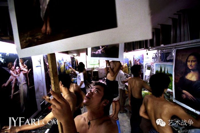 大芬村是低成本制造业的产物,有点类似深圳上市公司比亚迪的模式。比亚迪是发现手工和机器混合的制造模式,比纯机器制造模式成本更加低。所以比亚迪迅速成为世界电池制造业老二,现在开始制造汽车了。 大芬村和比亚迪一样,得益于中国低廉的手工劳动力成本,以及其他相应配套的低成本。在3D打印浮雕效果印刷技术没有普及之前,大芬村的手工工业化生成是成本最低的复制仿真油画名画的模式。 大芬村对人类美术历史的影响主要有2点: 1,人类美术史上的工业化序幕。 2,工业化生产带来的艺术泡沫的破灭。 1,人类美术史上的工业化序幕。 大芬村的最大发明,就是对手工油画绘制过程进行流水线作业的工业化改造。以前由一个人绘制一幅油画的生产过程,在大芬村变成由50个人流水线分工作业式绘制生产。 流水线作业的工业化绘画过程,彻底毁灭了人类对手工技术崇拜的愚昧心理。 大芬村在文化产业的工业化改造方面,建立了一个很有效的范本。文化产业的工业化改造,一直是个世界性的难题。也是未来文化产业发展的最大瓶颈。 举个例子:如何把一个高级视觉设计师的工作分解为50个步骤?而再由50个人普通的设计师来执行?这方面是国内没有专家,世界上也没有。 笔者多年的工作经历是边写程序,边做视觉设计,也常带一批设计师做复杂的设计,在视觉设计分工,视觉效果数学化方面有些体会和研究,也非常明白这方面的难度。 2,工业化生产带来的艺术泡沫的破灭。 大芬村把封建迷信思想笼罩的艺术品当作最普通的低价工艺品来卖,这就彻底地摧毁了艺术品本身的由迷信和愚昧制造的泡沫价值。这和798用封建迷信思想来忽悠手工油画的泡沫价值绝然相反。 大芬村也把传统貌似崇高美术工作者当作低等智力劳动者来使用,这就是大芬村的画工。 确实,大部分的美术工作者都是因为考不上大学而转学美术的,美术学院的招生分数超低,决定了美院学生的综合智力在社会所有行业中接近最低层。 崇高的艺术品当作最普通的工艺品,这是后现代对艺术价值的反思的延伸。早在几十年前,杜尚就拿尿壶到美术馆展览。杜尚认为达芬奇的《蒙娜丽莎》的艺术价值,和普通尿壶的艺术价值是等价的。 后现代思潮早就在上世纪60年代爆发,后现代把物质和人性回归其最本质的状态,后现代把崇高和下贱对等,后现代艺术思想摧毁了人类社会带来的愚昧崇拜,是西方文艺复兴之后最伟大的人性思想解放。 但后现代的艺术思想在国内艺术界是不受欢迎的,一些艺术家艺术思想停留于古典艺术中期,思想观念停留于农业文明的封建社会。 大芬村无意中从经济学的方式迈进了后现代美术阶段,也是在追求最低成本的生存压力下无意中对美术进行了工业化改造。 大芬村拉开了美术工业化的序幕,是由于人类生存本能而无意中摸索出来的,和艺术家无关。大芬村反而对落后的艺术思想和落后的艺术家带来致命的打击和毁灭性的颠覆。所谓的著名艺术家,大多都不如大芬村的低级画工。