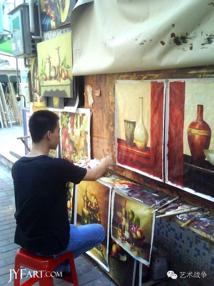 (导读:为什么798比大芬村落后 1000年?798是农业文明年代的美术形态,大芬村是工业文明年代的美术形态,相差1000年。798是强调个体创意的家庭作坊,大芬村是强调团队协作的工业化流程。798是一种手工劳动崇拜,标准的封建小农思想,大芬村则用廉价消解了农业文明时代蒙昧的手工劳动崇拜。798模式愚昧、落后,大芬村模式先进、工业化。所以798的农业文明模式要比大芬村的工业文明模式落后1000年。) 798 艺术泡沫炒作模式的结果是,炒高了低等智力手工劳动力的价值泡沫,画廊联手艺术家蒙骗收藏家。大芬村艺术生产模式的结果是,大幅度减低艺术品的制作成本,令普通市民用最廉价的价格购买精美的艺术品。不比不知道,一比吓一跳,一对比,798确实比大芬村落后1000年。 一,深圳大芬村,“大粪村” 大芬村因山寨油画而闻名于世界,同时也带来了艺术界的骂声连天,甚至给落得一个“大粪村”的外号。 大芬村收留很多怀才不遇的古典美术和现代艺术油画家,以致于大芬村的抽象油画是国内最好的,虽然才卖几十元一幅。 大芬村的抽象油画,这还有个故事:大约是2003年,一个从美国归国回来的艺术家,教了大芬村十几个油画家比较系统的抽象油画绘画技巧。 几年后,这些抽象绘画技巧就在大芬村流行开来。所以,大芬村的抽象行画,比国内最顶级抽象油画家要强很多。因为国内的抽象油画家都是自学的,找不到门路,只能瞎整。 经过世界级抽象艺术家培训的大芬村画家,就和没有经过系统抽象绘画技巧训练的国内抽象油画家,就拉开了很大的距离。 大芬村令很多自我感觉良好的油画家呕吐。很多自我感觉良好的油画家去了大芬,马上发现自己连普通的低级画工都不如,所以马上呕吐。也许这就是大芬村的意义。很多画家一辈子努力,发现自己的油画才值几十元,幻想破灭,于是骂大芬村出气,大芬村的骂名主要来源于此。 大芬村对艺术发展的意义,就是令那些画不过大芬画工的古典和现代油画家改行。整个中国的艺术区,美术学院都是在画行画。只不过大芬是最集中和价格最低的而已。 如果你的画放在大芬村,被淹没。那你就是一个最低级的美术爱好者,尽快改行,因为你确实连一个普通的低级画工都不如。 如果你的画放在大芬村,能跳出来。说明你还有点绘画基础,可以继续努力学习美术了。 二,798比大芬村落后1000年,停留于农业文明的手工崇拜。 简单对比大芬村和798之后,可以得出比较骇人的结论。 北京798是农业文明年代的美术形态,大芬村是工业文明年代的美术形态。798模式确实要比大芬村模式落后1000年。 798模式还停留于1000年前对手工油画的崇拜,手工油画作为人类农业文明时代的产物,早就已经失去意义和价值。798把失去艺术价值的手工油画炒上天价,这就是很明显的农业文明时代的手工崇拜。 但798在思想观念本质就更加落后,类似于人类原始社会的动物图腾崇拜。原始社会的人类会用几百个少女的生命的来献祭一头野兽。798也是一样的,用几百万、几千万来购买手工动物图腾。 所以,798的本质是农业文明时代的美术形态,大芬村的本质是工业文明时代的美术形态。798模式确实要比大芬村模式落后1000年。